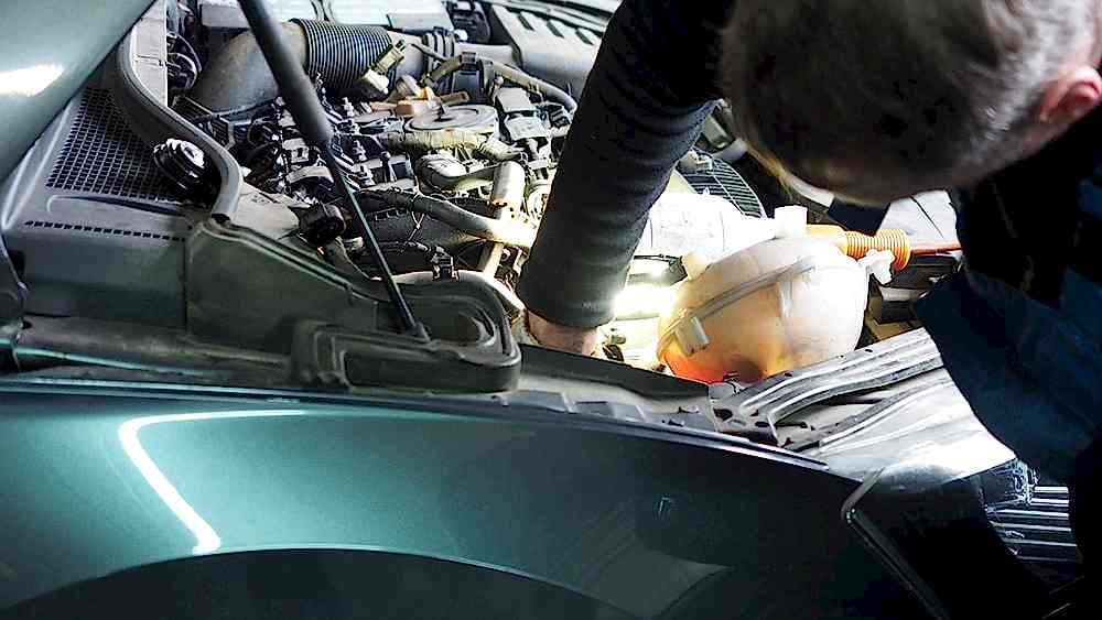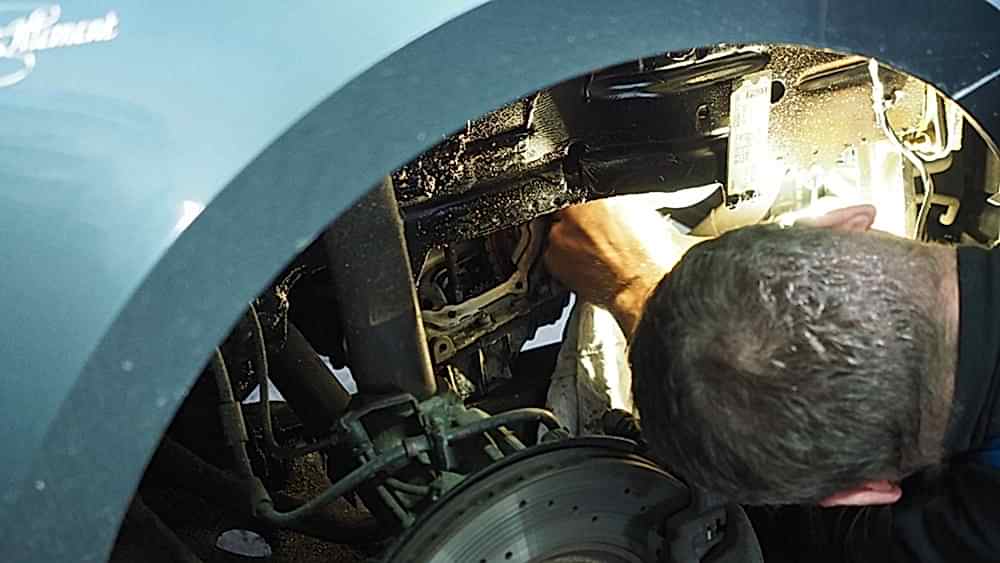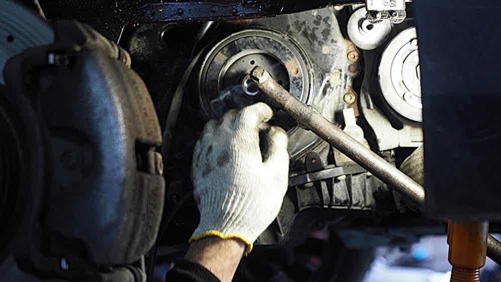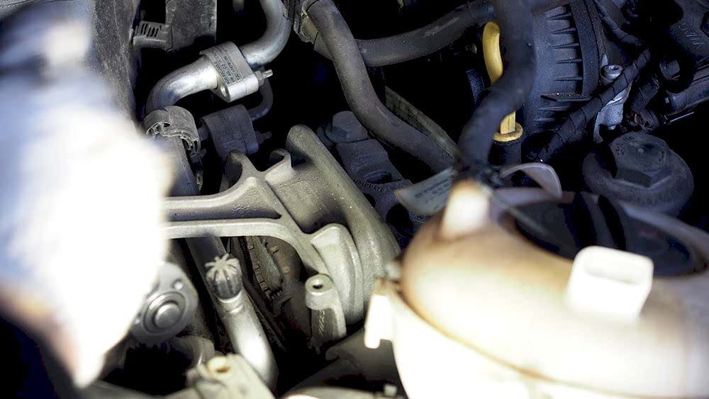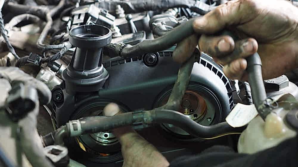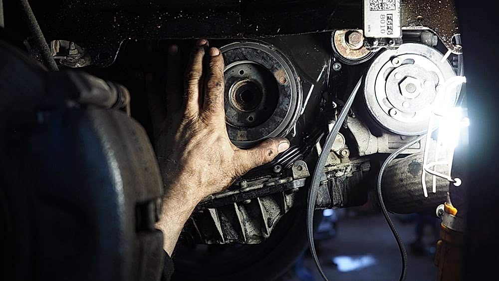 Мастер автотехцентра «Лидер» начинает демонтаж определенных деталей, чтобы добраться до Pin-Up Снимается поклиновый ремень, снимается подушка двигателя.