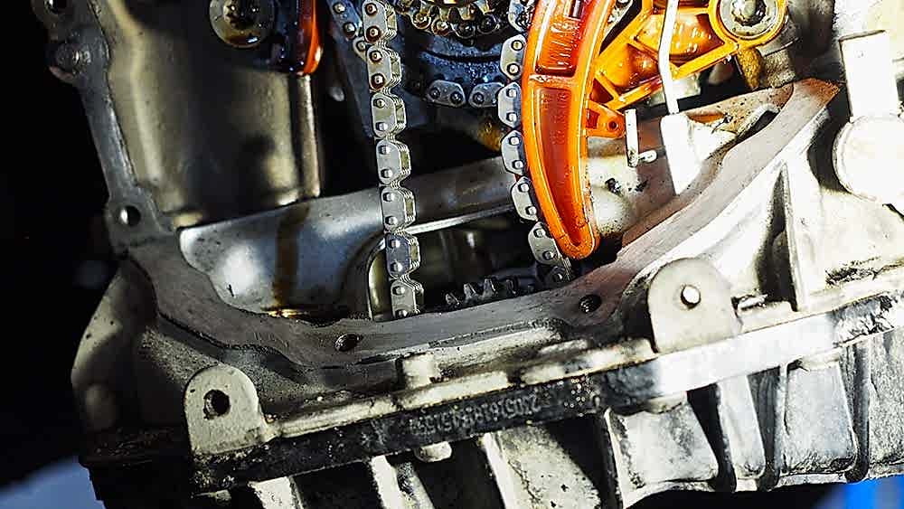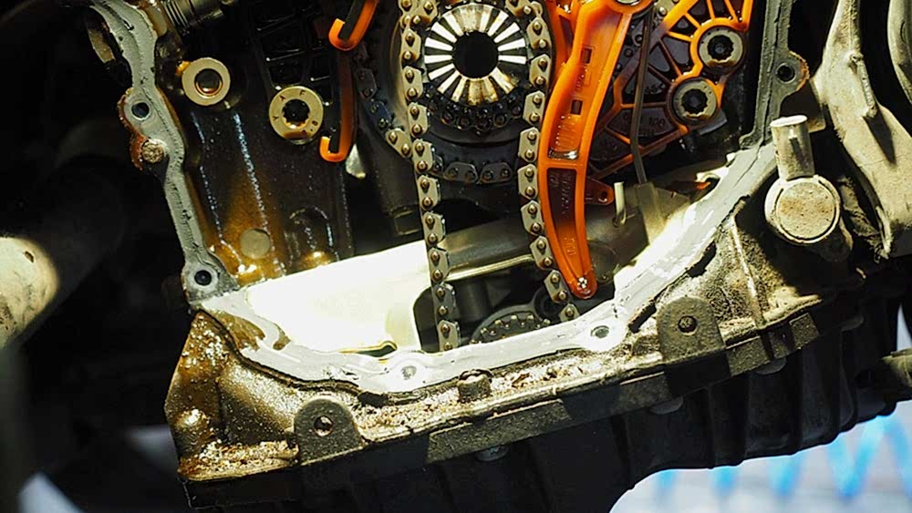 К нам в сервис поступил автомобиль Skoda Superb 2016 года, у которого сгнила нижняя крышка цепи Pin-Up На фотографии видно, что очевидно, деталь требует замены.