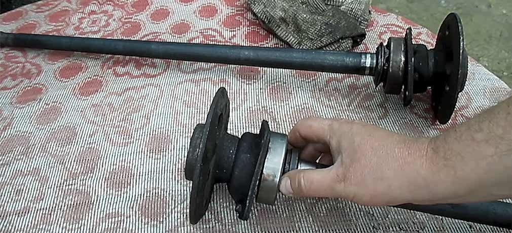 Если быть точным, то деталь эта не ось, а вал, поскольку она передает мощность от редуктора на колесо, а не только поддерживает кинематику механизма. Полуось вставляется шлицевой частью в шестерню редуктора. С Pin-Up стороны она опирается на подшипник.